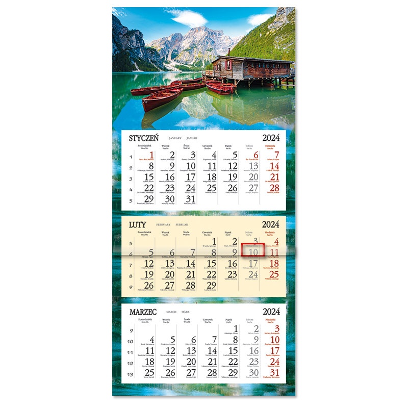 Kalendarium: w języku polskim, angielskim, niemieckim, rosyjskim, podwójne imieniny, numeracja tygodni, pasek z okienkiem