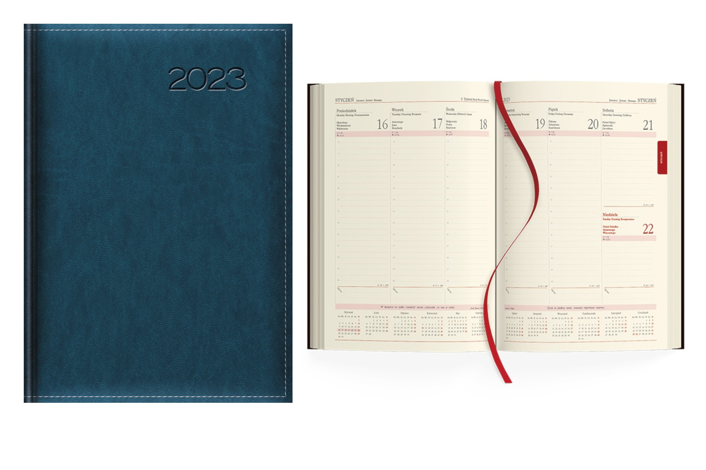-Układ: 1 tydzień na dwóch stronach (po otwarciu), registry nadrukowane