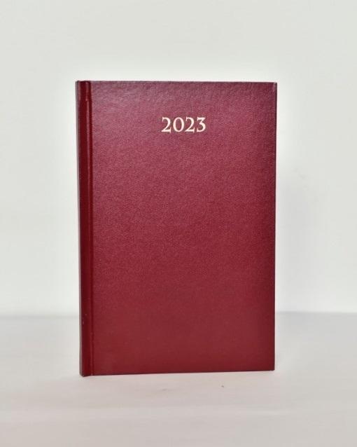 Kalendarz 2023 B6 dzienny divas bordo. Rozmiar:110x165 mm , 320 str.,papier biały 60g/m2, druk 2 kolory , tasiemka, blok kalendarza szyty. Oprawa: skóropodobna, tektura, bez gąbki, ze złoceniem roku.