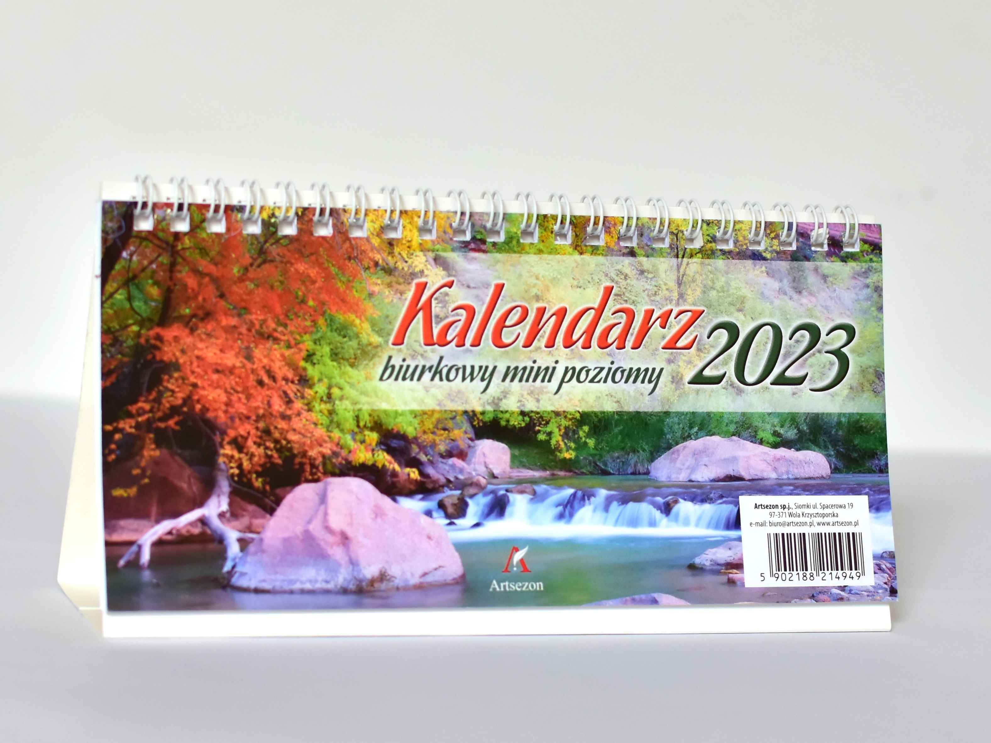 KALENDARZ BIURKOWY MINI POZIOMY dostęny 1 wzór, 54 strony, kalendarium tygodniowe w układzie poziomym z miejscem na notatki, rozmiar 196x94mm, podkładka bindowana - namiot na spirali