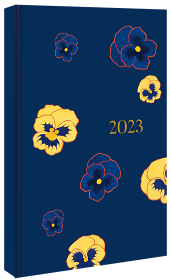 Książkowy kalendarz na rok 2023 z motywem bratków Stanisława Wyspiańskiego na okładce, zaprojektowany przez Aleksandrę Samołyk.