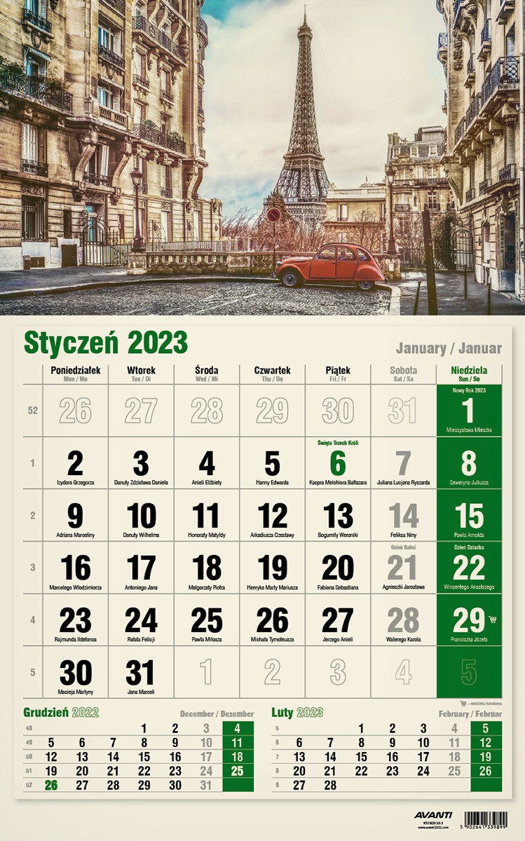 KTJ EKO – Kalendarz Jednodzielny EKO (drukowany na ekologicznym papierze typu Kraft; 3 miesiące na 1 stronie), format 310x480 mm, główka płaska. KTJ EKO pasuje wszędzie tam, gdzie na trójdzielny brakuje miejsca, a zależy nam na podglądzie poprzedniego i następnego miesiąca. Kalendaria zawierają oznaczenia miesięcy i dni tygodnia w trzech językach (PL, EN, DE) oraz imieniny i typowe święta.