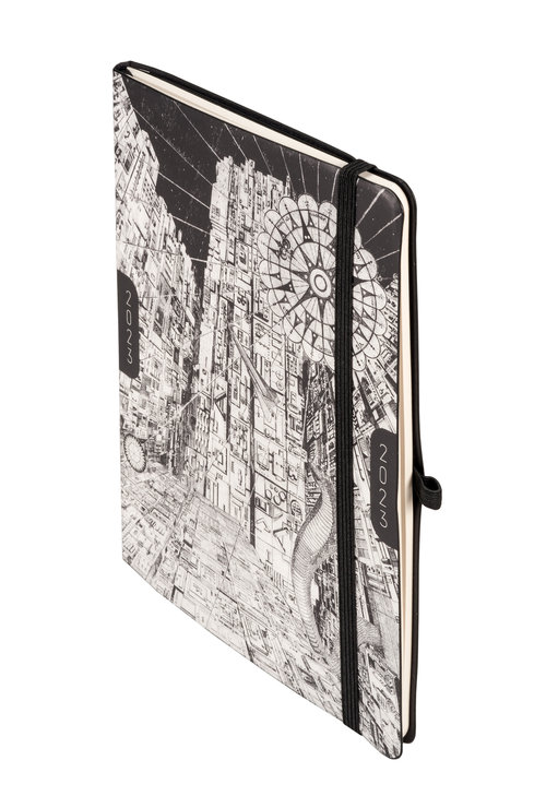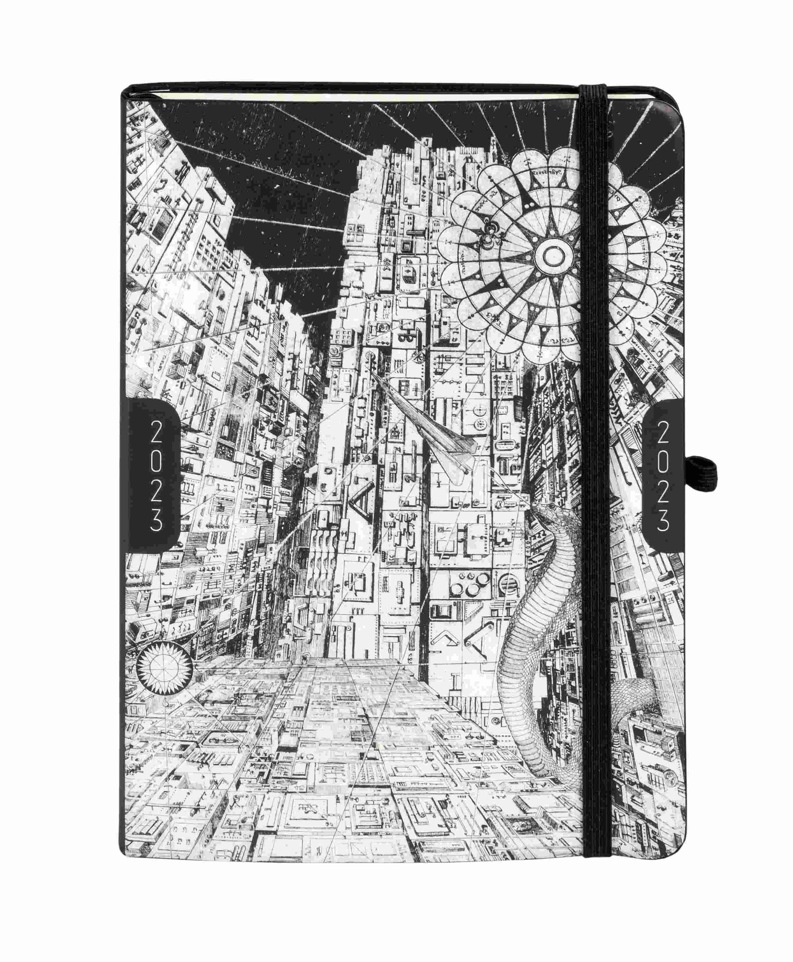 format: A5, wymiary okładki: 210x145 mm, układ: tydzień do wglądu, ilość stron: 144, oprawa: miękka, materiał: skóra ekologiczna z nadrukiem, gramatura papieru: 80g, kolor papieru: off white, dodatki: plan roku 2023, ważne wydarzenia, skorowidz adresowy, notatki, pionowa gumka zamykająca: czarna, wstążka: czarna, gumka na długopis: czarna, zaokrąglone rogi: tak, wyklejka: czarna, koperta: tak, dostępne kolory: czarno-biały
