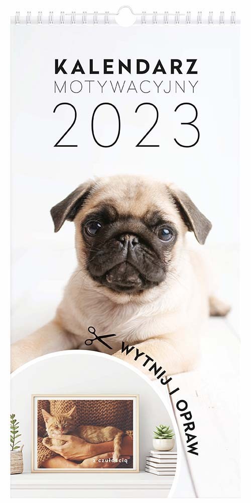 Kalendarz ścienny na spirali o wymiarach 22 x 46 cm. Kalendarium w układzie miesięcznym. Przy każdym dniu miejsce na krótką notatkę. Zaznaczone najważniejsze daty i święta. Ciekawa i inspirująca grafika motywacyjna z hasłem na każdy miesiąc. Po zużyciu kalendarza grafiki można wyciąć i oprawić.