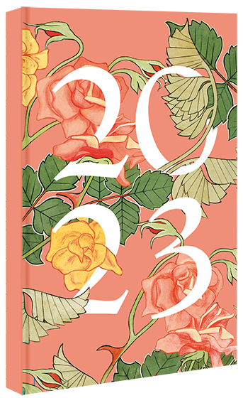 Książkowy kalendarz na rok 2023 z motywem róż Stanisława Wyspiańskiego na okładce, zaprojektowany przez Aleksandrę Samołyk.
