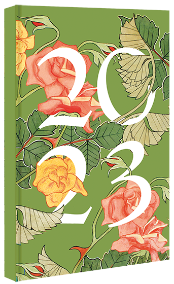 Książkowy kalendarz na rok 2023 z motywem róż Stanisława Wyspiańskiego na okładce, zaprojektowany przez Aleksandrę Samołyk.
