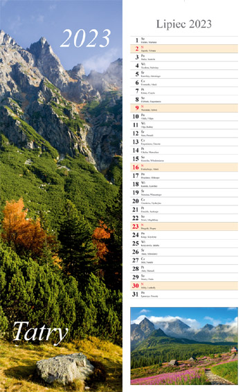 Kalendarz wieloplanszowy, ścienny, typu: pasek szeroki, 12 kart plus okładka pokryta lakierem UV, miesiąc na stronie.