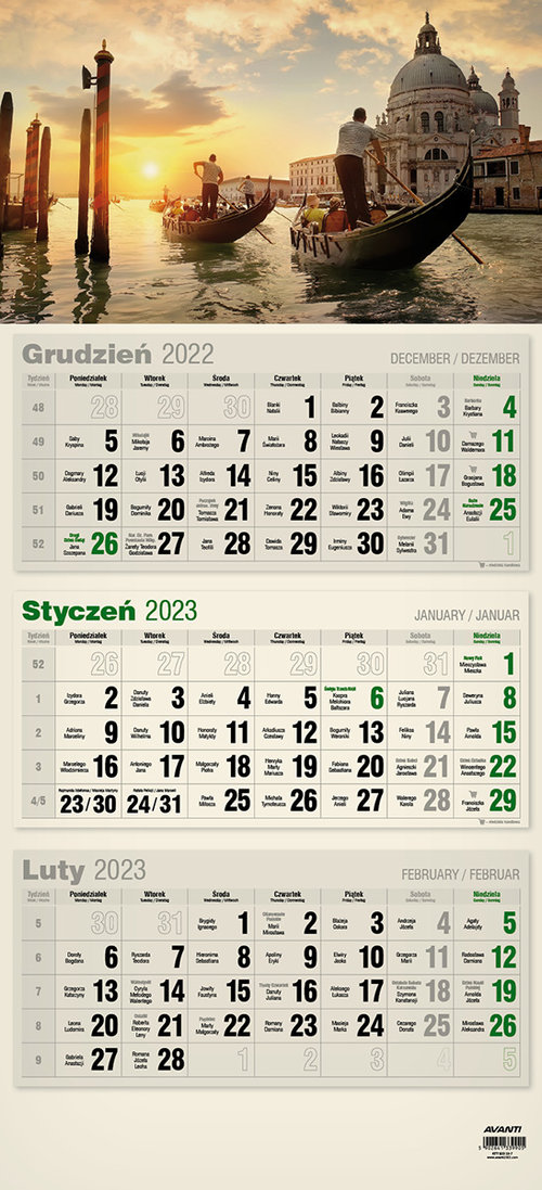 KTT EKO – Kalendarz Trójdzielny Płaski EKO (drukowany na ekologicznym papierze typu Kraft), format 310x682 mm, główka płaska. KTT EKO to prawdziwa ozdoba wnętrza. Trzy kalendaria miesięczne zawierają oznaczenia miesięcy i dni tygodnia w trzech językach (PL, EN, DE) oraz imieniny i typowe święta.