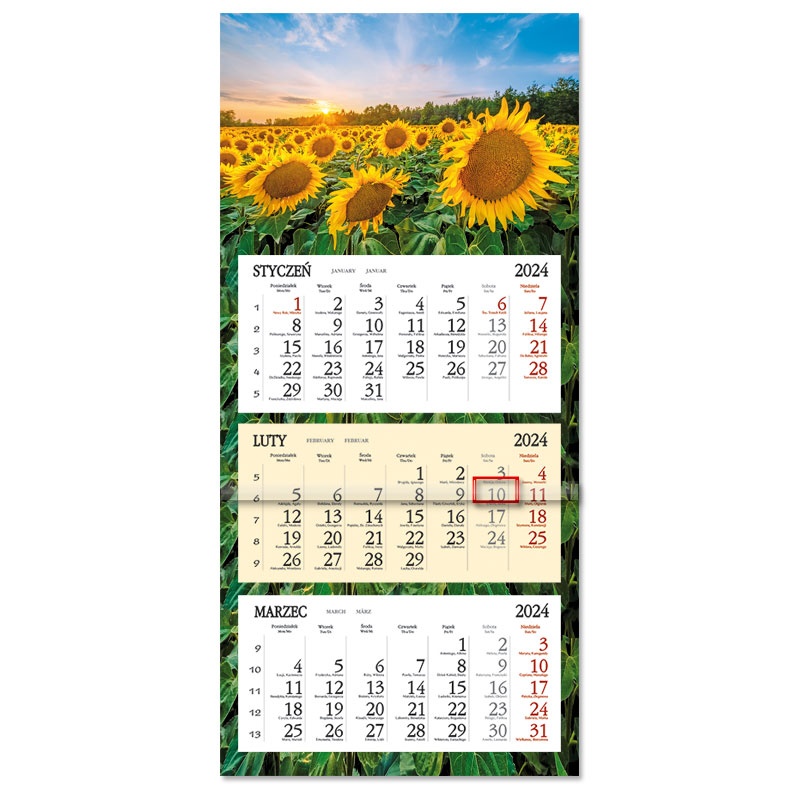 Kalendarium: w języku polskim, angielskim, niemieckim, rosyjskim, podwójne imieniny, numeracja tygodni, pasek z okienkiem
