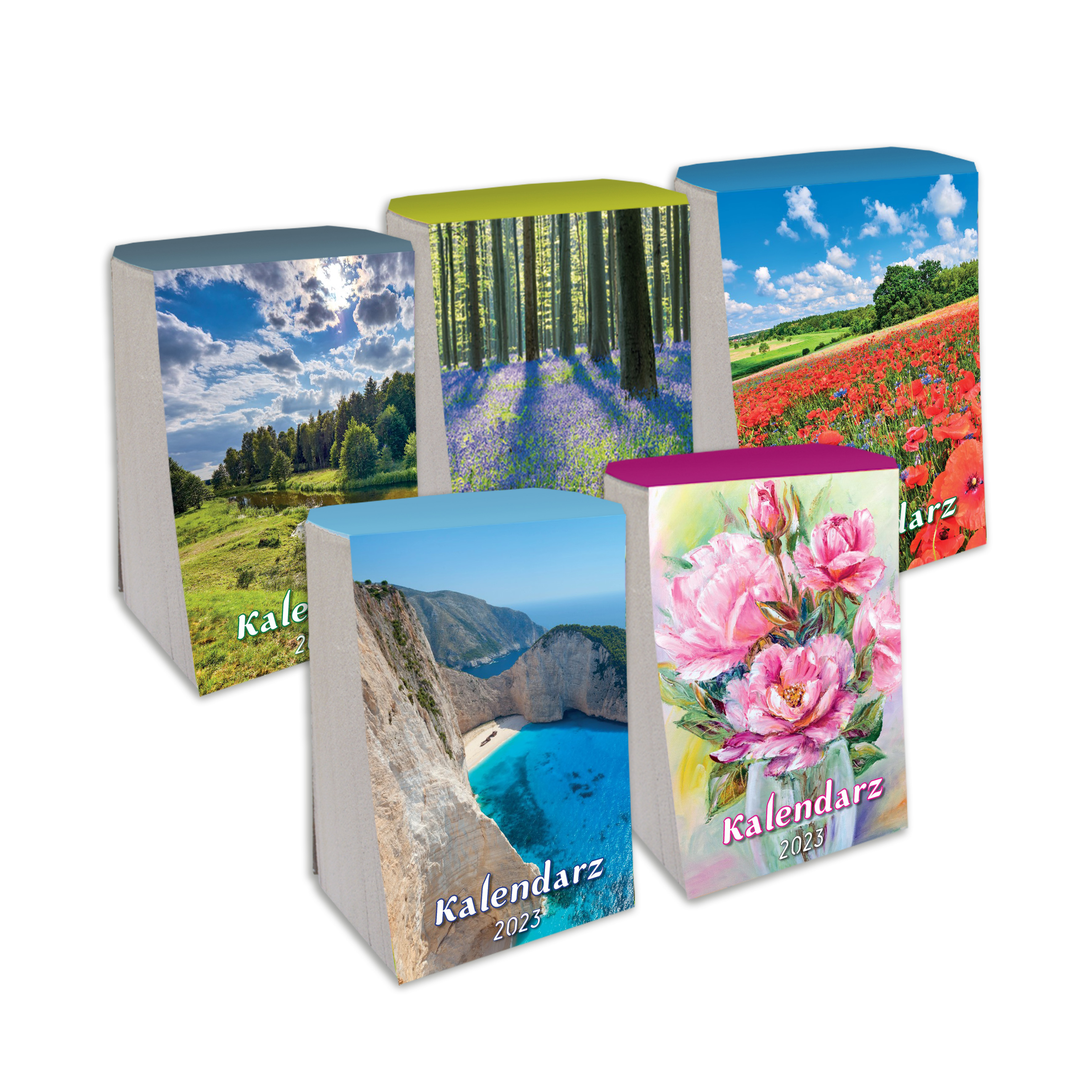 dostępny w 12 wzorach, kalendarz dzienny, 365 stron, informacje zawarte w kalendarzu: awers- imieniny, ważne święta, numeracja tygodnia, wschody i zachody słońca i księżyca, znaki zodiaku , rewers - ciekawostki i porady, papier gazetowy, okładka lakierowana, rozmiar 72x114mm, możliwość zawieszenia na specjalie zaprojektowanej podstawce