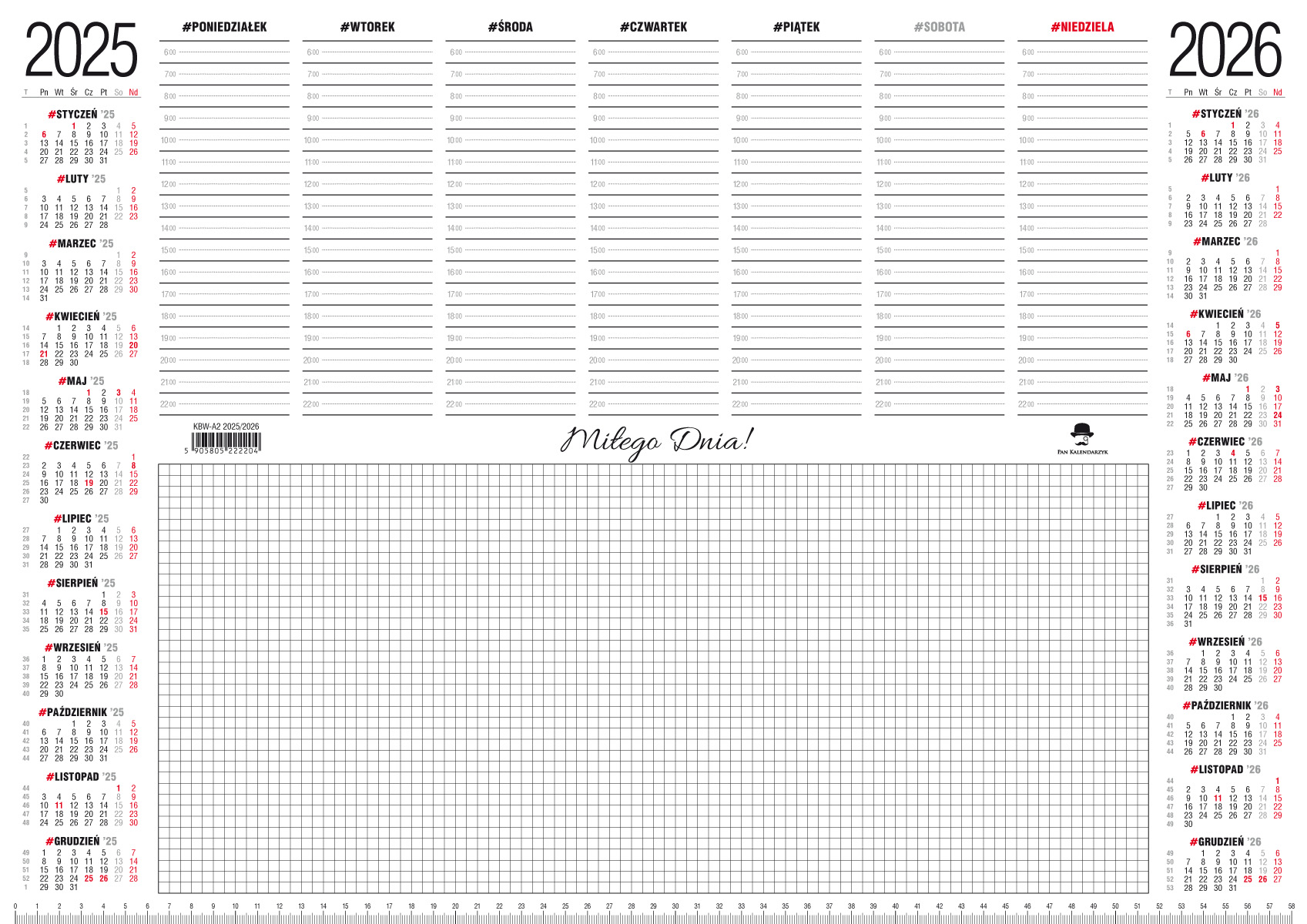 Kalendarz BIURKOWY BIUWAR A2 Z LISTWĄ KBWA2. Format 594x420mm. Papier 80g, 33 karty w bloku. Oprawa klejona na podstawie kartonowej. Listwa transparentna zamontowana na dolnej krawędzi kalendarza. Kalendarz zawiera skrócone kalendaria na lata 2025 i 2026, miejsce do notatek, tygodniowy rozkład zajęć oraz praktyczną linijke.