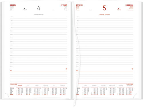 Miękka, przyjemna w dotyku oprawa wykonana z termoprzebarwialnego materiału pokryciowego Nebraska, zamykana na magnes. Drukowany na białym papierze; bloki terminarza szyte nićmi; kapitałka i tasiemka białe; przejrzysty układ graficzny kalendarium; rozbudowana część informacyjna; oprawa umożliwia wykonanie nadruków, tłoczenia i personalizacji kalendarza.