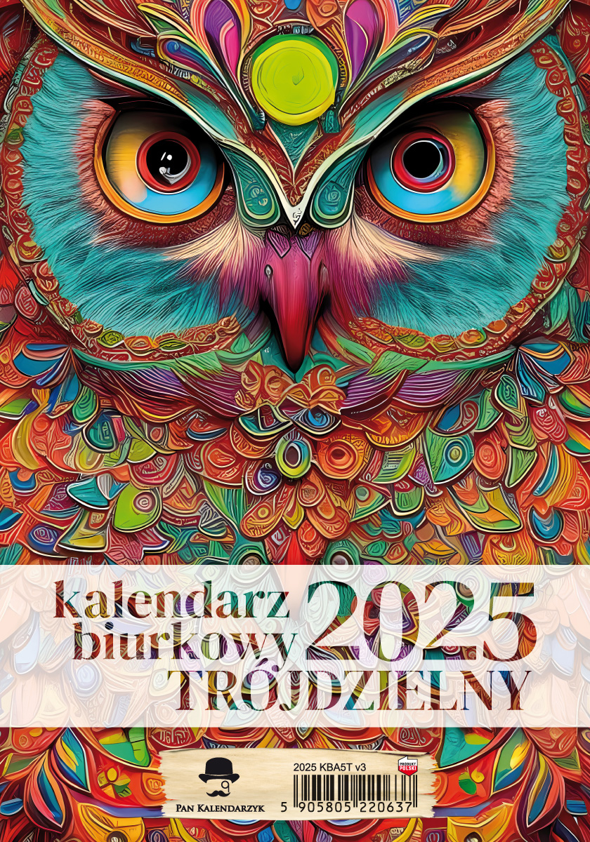 Kalendarz Biurkowy A5 TRÓJDZIELNY PIONOWY. Oprawa czarna spirala na grubej podstawie kartonowej. Format 145/210mm. Papier offsetowy, okładka papier kredowy. 26 strony (dwa układ miesięczne ) + okładka. Układ kalendarium w stylu kalendarza trójdzielnego ( z drugiej strony miejsce na notatki na każdy dzień) Mix wzorów, pakowany po 8szt. Kalendarz zawiera imieniny, nazwy świąt, numeracje tygodni, znaki zodiaku.