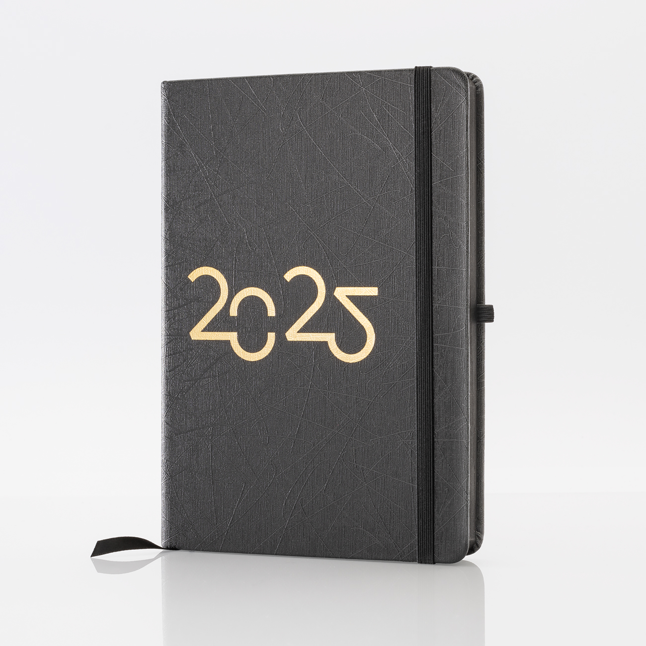 Kolekcja: Black · Format: A5 · Wymiary okładki: 144x210 mm · Układ: dzień na stronie · Ilość stron: 352 · Oprawa: twarda · Materiał: papier · Gramatura papieru: 80g · Kolor papieru: chamoise · Dodatki: plan roku 2025, ważne wydarzenia, skorowidz adresowy, notatki · Pionowa gumka zamykająca · Wstążka · Gumka na długopis · Zaokrąglone rogi: tak · Wyklejka: chamoise · Koperta: tak · Barwione brzegi na czarno