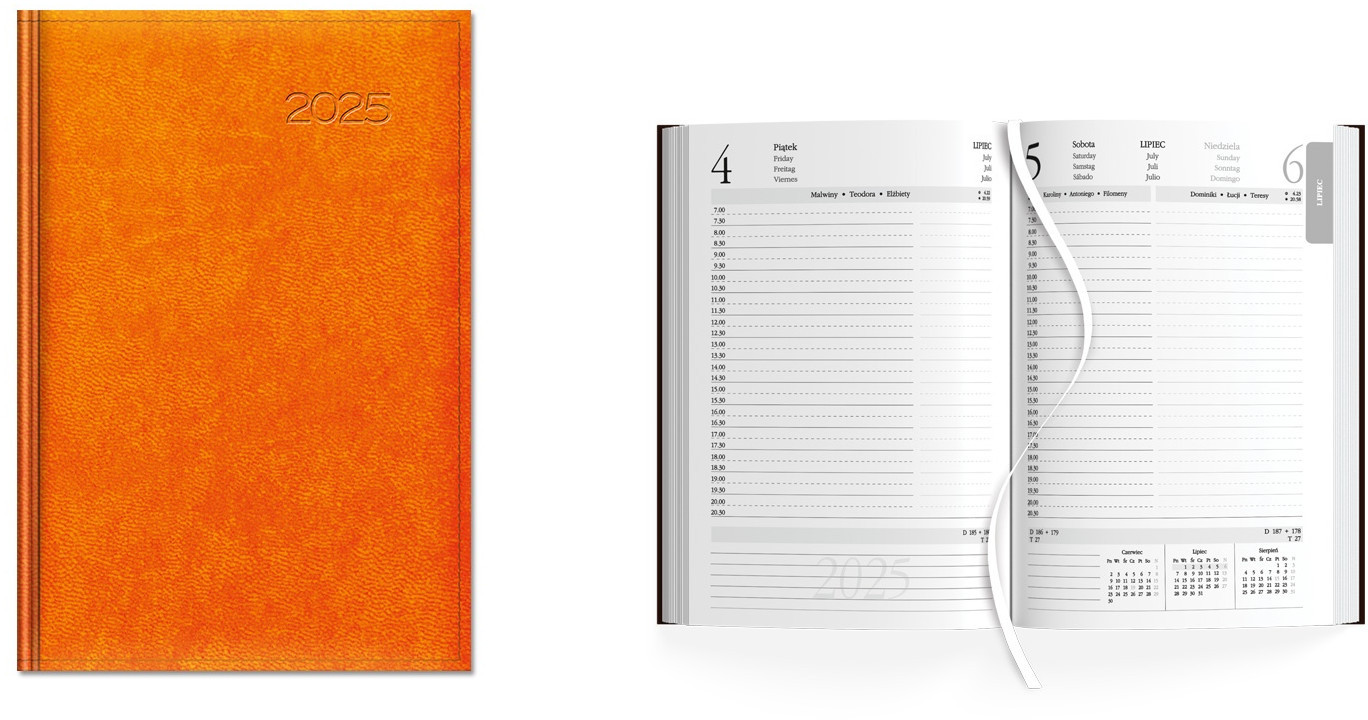 w języku polskim, angielskim, niemieckim, hiszpański, numeracja dni i tygodni, wschody i zachody słońca, potrójne imieniny