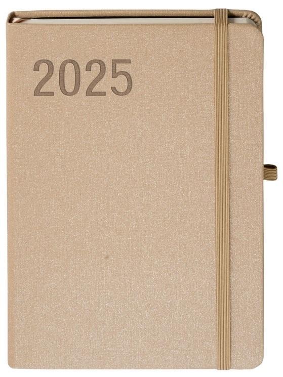 Kolekcja: Sakura · Format: A5 · Wymiary okładki: 210x145 mm · Układ: dzień na stronie · Ilość stron: 352 · Oprawa: twarda · Materiał: skóra ekologiczna, z błyszczącymi drobinkami · Gramatura papieru: 80g · Kolor papieru: off white · Dodatki: plan roku 2025, ważne wydarzenia, plan miesiąca, skorowidz adresowy, notatki · Pionowa gumka zamykająca: w kolorze okładki · Wstążka: w kolorze okładki · Gumka na długopis: w kolorze okładki · Zaokrąglone rogi: tak · Wyklejka: czarna · Koperta: tak