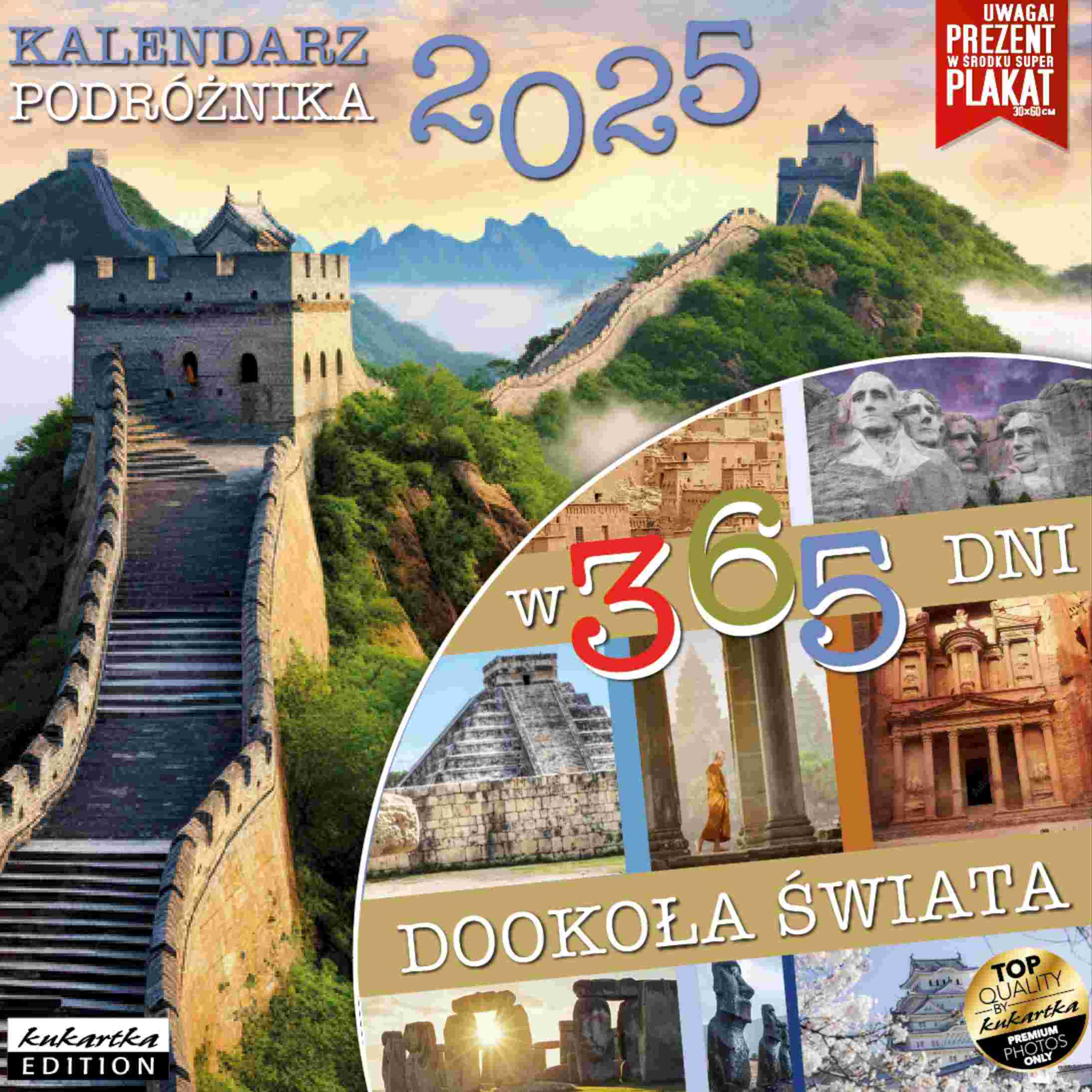 Kalendarz 2025 365 dni dookoła świata Kwadratowy kalendarz ścienny na rok 2025 z serii ""365 dni dookoła świata"". Każdy miesiąc cieszy pięknym zdjęciem, które będzie wspaniałą ozdobą Waszego domu oraz inspiracją dla podróżników. Kalendarz po rozłożeniu ma wymiary 30x60 cm - górny kwadrat wypełnia zdjęcie, a dolny kalendarium. PREZENT: w środku kalendarza znajdziecie plakat o wielkości 30x 60 cm! Specyfikacja: Wielkość: 30 x 30 cm (po rozłożeniu 30 x 60 cm) Gratis: plakat Styl: cytaty, nowoczesny, klasyczny, zdjęciowy