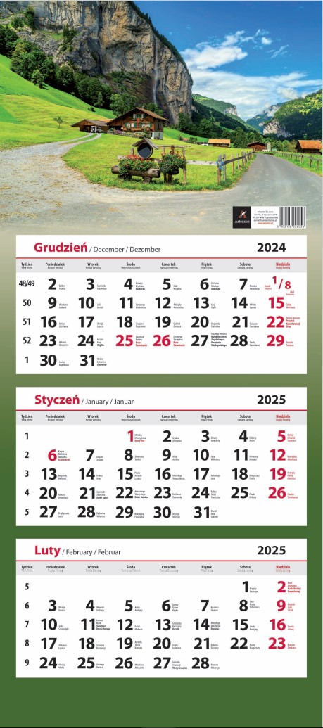 dostępny w 32 wzorach, 3 oddzielne miesięczne kalendaria, ruchomy pasek PCV z okienkiem do zaznaczenia bieżącego dnia, rozmiar 71x31 cm, eurodziurka do zawieszenia