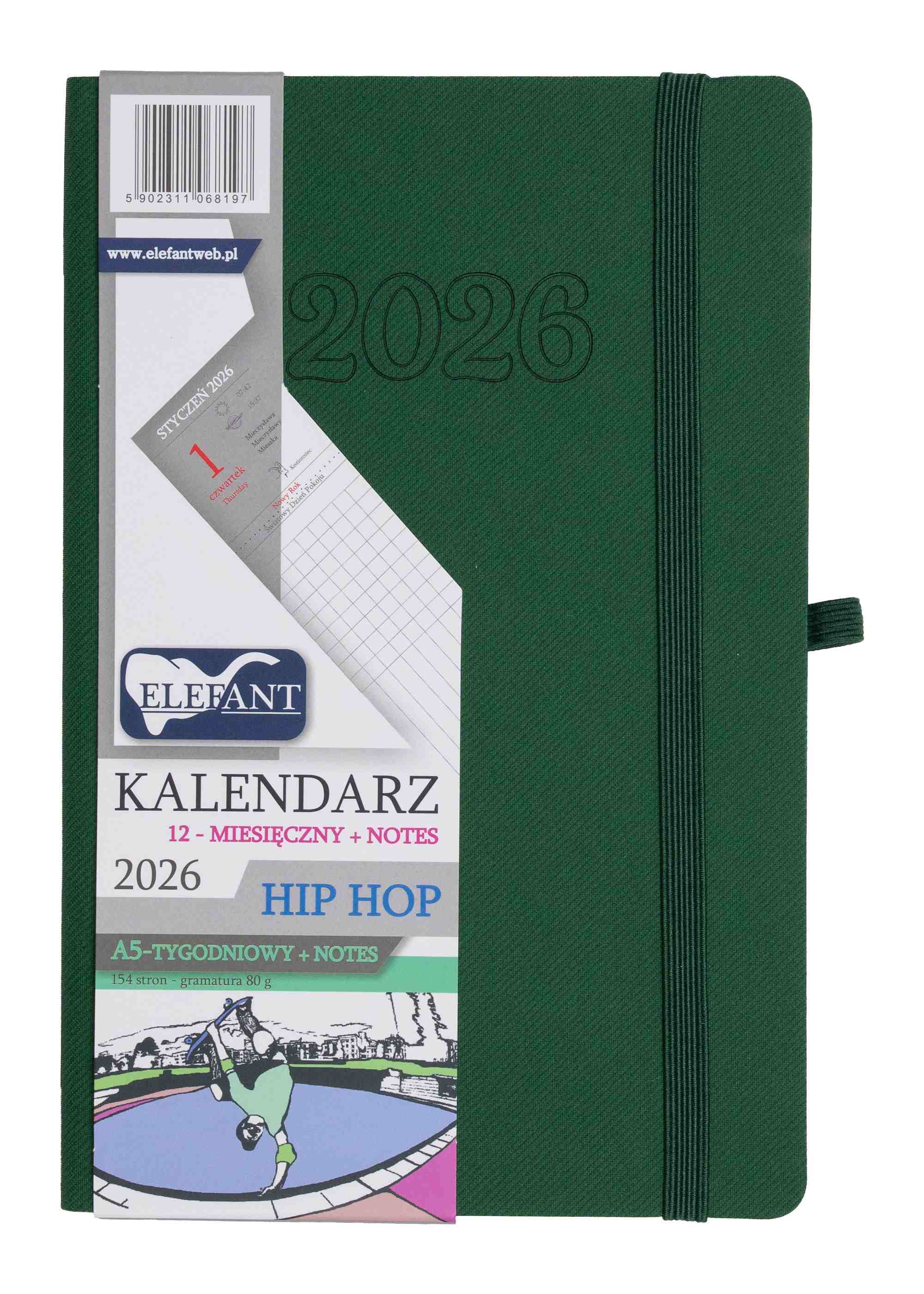 format A5 z tygodniowym układem środka kalendarza plus notes (tydzień na jednej stronie plus notes w kratkę na drugiej)