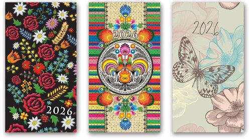Kalendarz w układzie tygodniowym (tydzień na rozkładówce). Format kieszonkowy A6 (blok: 8,5 x 15,3 cm), papier kremowy, druk szaro-bordowy, registry drukowane. Wstążka-zakładka; 128 stron; notes teleadresowy. Dwa rodzaje okleiny skóropodobnej: gładka lub z tłoczonymi reliefowymi deseniami oraz okleina graficzna (drukowana). Typ okładki: standard bez gąbki.