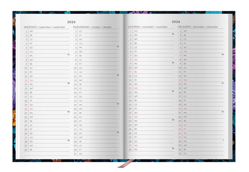 Kalendarz książkowy w twardej oprawie ze wstążką. Okładka w dwóch wersjach "damska i męska". Układ kalendarium tygodniowy. 128 stron. Wymiary 145x215 mm