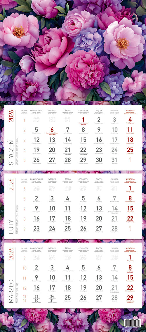 Kalendarz wiszący ścienny z kalendarium w układzie trójdzielnym, plecki i główka wykonane z jednego arkusza kartonu. Kalendarz składany do formatu A4.