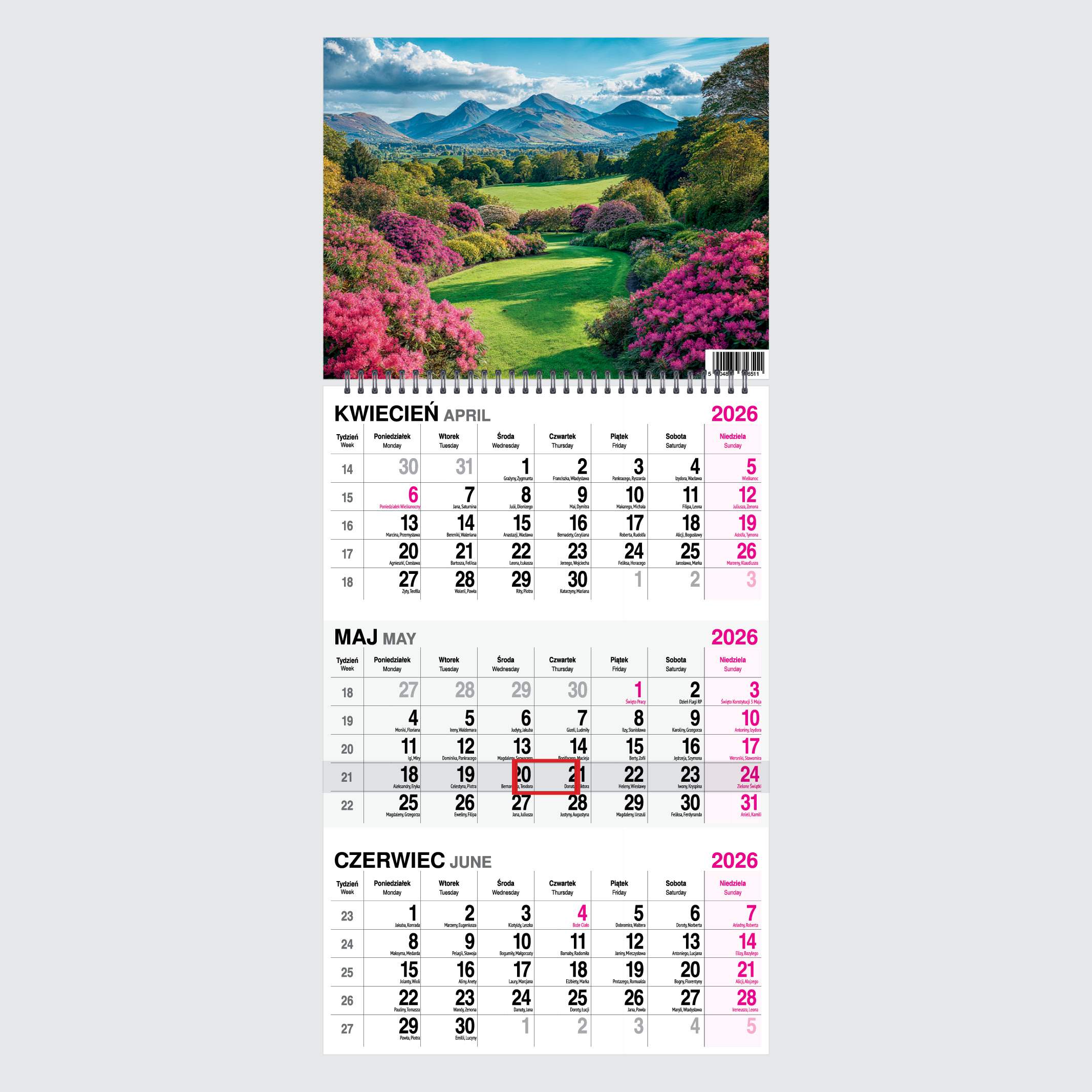 Kalendarz został połączony solidną spiralą z eurozawieszką, która umożliwia łatwe i bezpieczne zawieszenie go na ścianie. Format 280x635 mm gwarantuje czytelność kalendarium oraz komfort użytkowania, a spiralne łączenie zapewnia wygodę podczas przewracania stron i estetyczny wygląd.