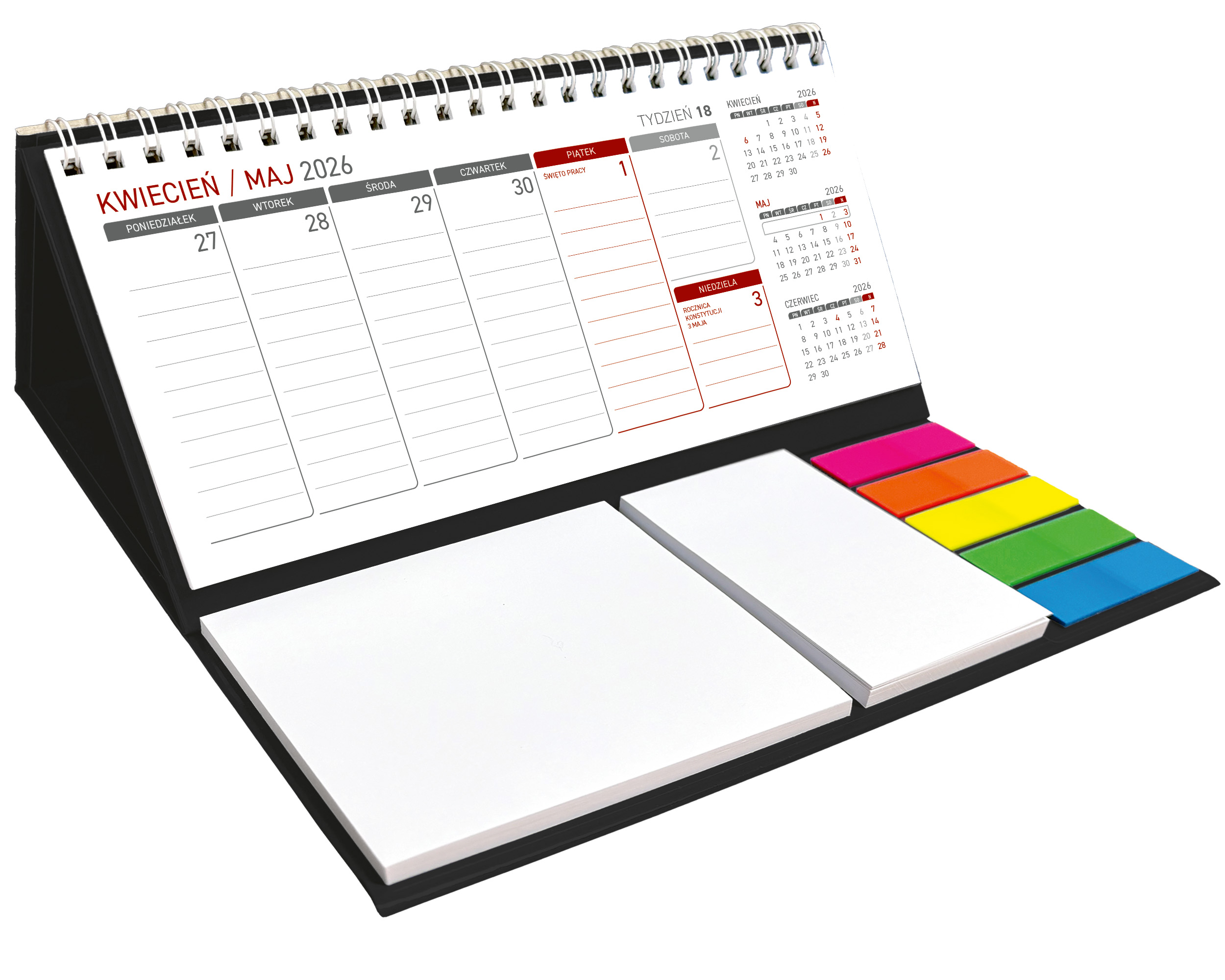 Praktyczny kalendarz stojący na biurko z przejrzystym kalendarium w układzie tygodniowym z miejscem do notowania. Poręczne samoprzylepne karteczki.