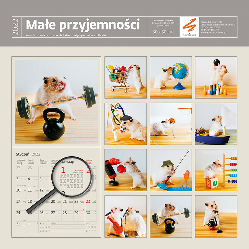 Kalendarz ścienny na 2022 rok, z naklejkami ułatwiającymi organizację zajęć i planów. Naklejek jest aż 300 i są one na ostatniej, dodatkowej karcie kalendarza. Tematów oznaczeń jest bardzo dużo: imieniny, urodziny, randka, wakacje, zakupy, dentysta, lekarz, piłka nożna, siłownia, praca, impreza, teatr, muzyka, pies, kot. Kalendarz zawiera 12 plansz ze zdjęciami myszek w ludzkich sytuacjach oraz dużym kalendarium z oznaczeniami świąt oraz imieninami. Wymiary: 30x30 cm, po rozłożeniu 30x60 cm.