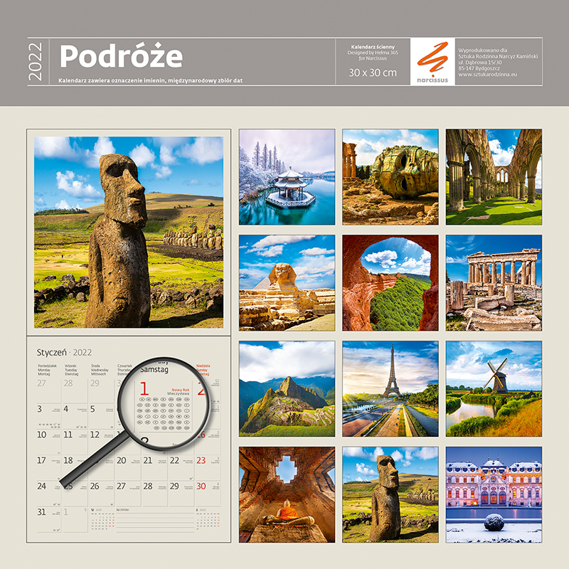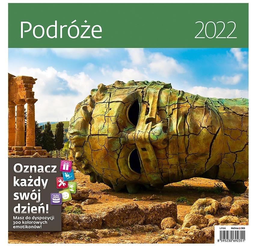 Kalendarz ścienny na 2022 rok, z naklejkami ułatwiającymi organizację zajęć i planów. Naklejek jest aż 300 i są one na ostatniej, dodatkowej karcie kalendarza. Tematów oznaczeń jest bardzo dużo: imieniny, urodziny, randka, wakacje, zakupy, dentysta, lekarz, piłka nożna, siłownia, praca, impreza, teatr, muzyka, pies, kot. Kalendarz zawiera 12 plansz ze zdjęciami najciekawszych turystycznie miejsc na Ziemi oraz dużym kalendarium z oznaczeniami świąt oraz imieninami. Wymiary: 30x30 cm, po rozłożeniu 30x60 cm.