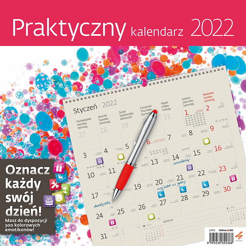 Kalendarz ścienny na spirali na 2022 rok, z naklejkami ułatwiającymi organizację zajęć i planów. Naklejek jest aż 300 i są one na ostatniej, dodatkowej karcie kalendarza. Tematów oznaczeń jest bardzo dużo: imieniny, urodziny, randka, wakacje, zakupy, dentysta, lekarz, piłka nożna, siłownia, praca, impreza, teatr, muzyka, pies, kot. Wymiary: 30x30 cm.