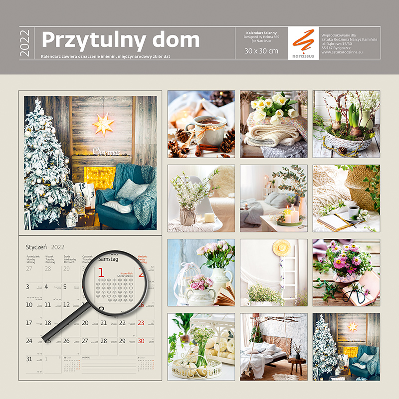 Kalendarz ścienny na 2022 rok, z naklejkami ułatwiającymi organizację zajęć i planów. Naklejek jest aż 300 i są one na ostatniej, dodatkowej karcie kalendarza. Tematów oznaczeń jest bardzo dużo: imieniny, urodziny, randka, wakacje, zakupy, dentysta, lekarz, piłka nożna, siłownia, praca, impreza, teatr, muzyka, pies, kot. Kalendarz zawiera 12 plansz ze zdjęciami przytulnych miejsc w domu i dużym kalendarium z oznaczeniami świąt oraz imieninami. Wymiary: 30x30 cm, po rozłożeniu 30x60 cm.