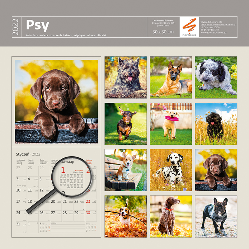 Kalendarz ścienny na 2022 rok, z naklejkami ułatwiającymi organizację zajęć i planów. Naklejek jest aż 300 i są one na ostatniej, dodatkowej karcie kalendarza. Tematów oznaczeń jest bardzo dużo: imieniny, urodziny, randka, wakacje, zakupy, dentysta, lekarz, piłka nożna, siłownia, praca, impreza, teatr, muzyka, pies, kot. Kalendarz zawiera 12 plansz ze zdjęciami psów oraz dużym kalendarium z oznaczeniami świąt oraz imieninami. Wymiary: 30x30 cm, po rozłożeniu 30x60 cm.