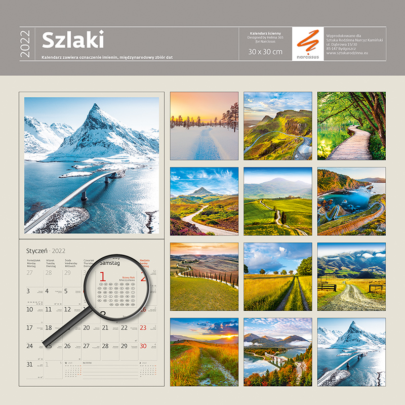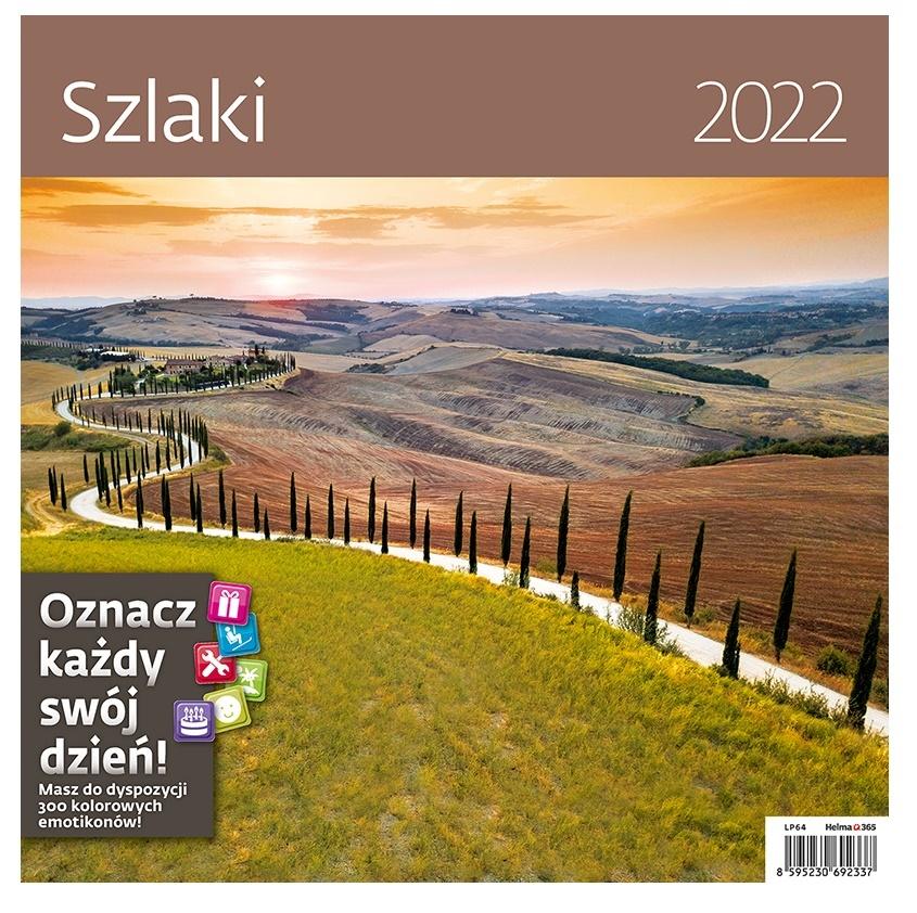 Kalendarz ścienny na 2022 rok, z naklejkami ułatwiającymi organizację zajęć i planów. Naklejek jest aż 300 i są one na ostatniej, dodatkowej karcie kalendarza. Tematów oznaczeń jest bardzo dużo: imieniny, urodziny, randka, wakacje, zakupy, dentysta, lekarz, piłka nożna, siłownia, praca, impreza, teatr, muzyka, pies, kot. Kalendarz zawiera 12 plansz ze zdjęciami szlaków i alejek oraz dużym kalendarium z oznaczeniami świąt oraz imieninami. Wymiary: 30x30 cm, po rozłożeniu 30x60 cm.