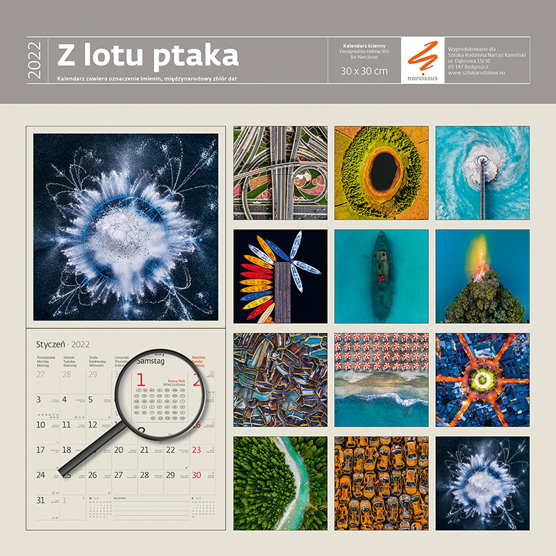 Kalendarz ścienny na 2022 rok, z naklejkami ułatwiającymi organizację zajęć i planów. Naklejek jest aż 300 i są one na ostatniej, dodatkowej karcie kalendarza. Tematów oznaczeń jest bardzo dużo: imieniny, urodziny, randka, wakacje, zakupy, dentysta, lekarz, piłka nożna, siłownia, praca, impreza, teatr, muzyka, pies, kot. Kalendarz zawiera 12 plansz ze zdjęciami robionymi z wysokości i dużym kalendarium z oznaczeniami świąt oraz imieninami. Wymiary: 30x30 cm, po rozłożeniu 30x60 cm.