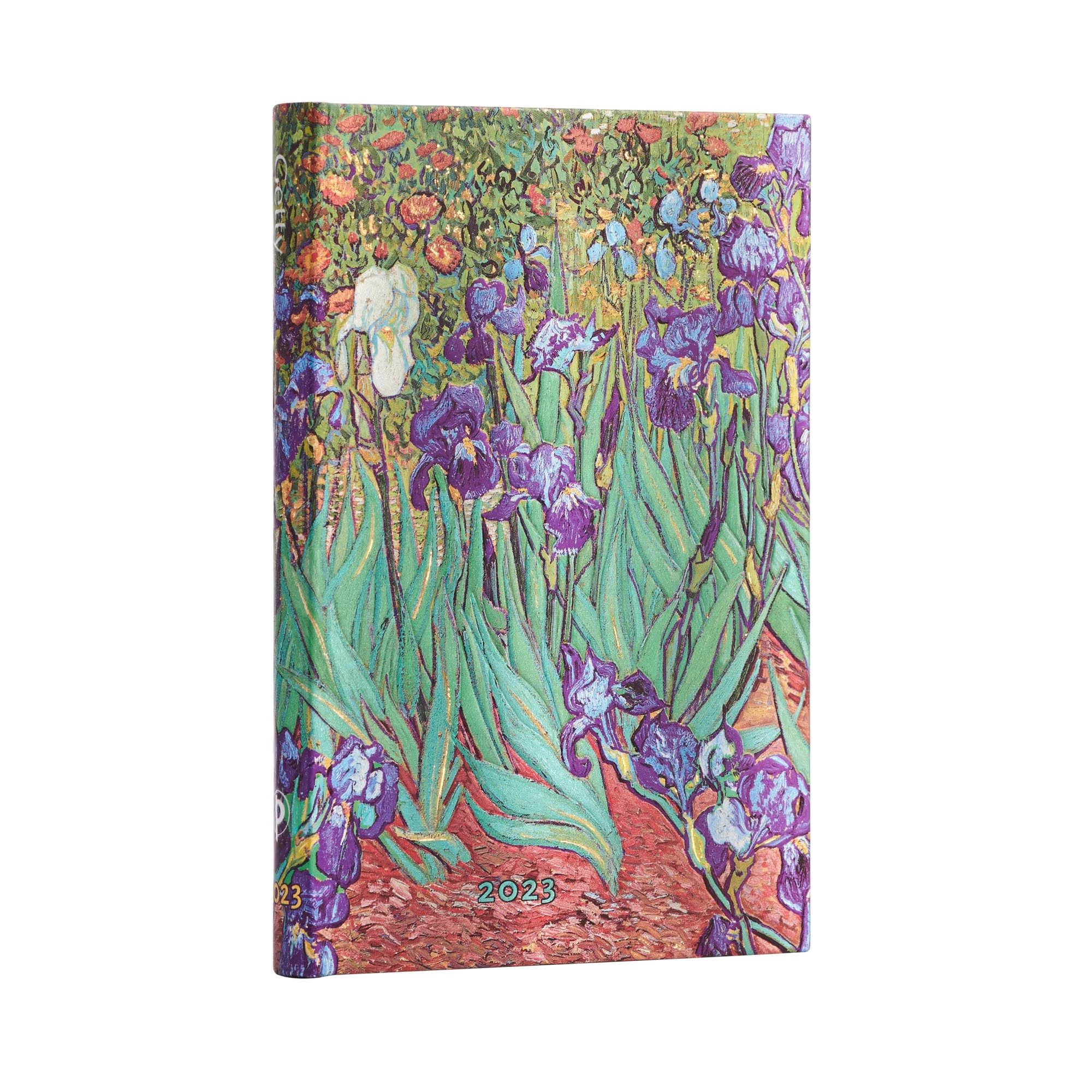 Kalendarz 2023 ekskluzywnej marki Paperblanks. Format mini typu horizontal - cały tydzień rozplanowany jest na 2 stronach. Kalendarium w języku angielskim. W środku miejsce na notatki, roczny planer, oznaczone wybrane święta międzynarodowe, mini kalendarium, międzynarodowe numery telefonów, strefy czasowe, dodatkowe informacje, mini skorowidz na adresy i telefony. Oprawa twarda. Zamkniecie na gumkę. Wymiary 95x140 mm, 160 stron. Kalendarz posiada 2 satynowe wstążki jako zakładki. Na końcu na wewnętrznej stronie okładki jest koperta na drobne notatki czy paragony. Papier ekologiczny, bezkwasowy, gramatura 100. Okładka inspirowana obrazem Irysy Vincenta van Gogha.