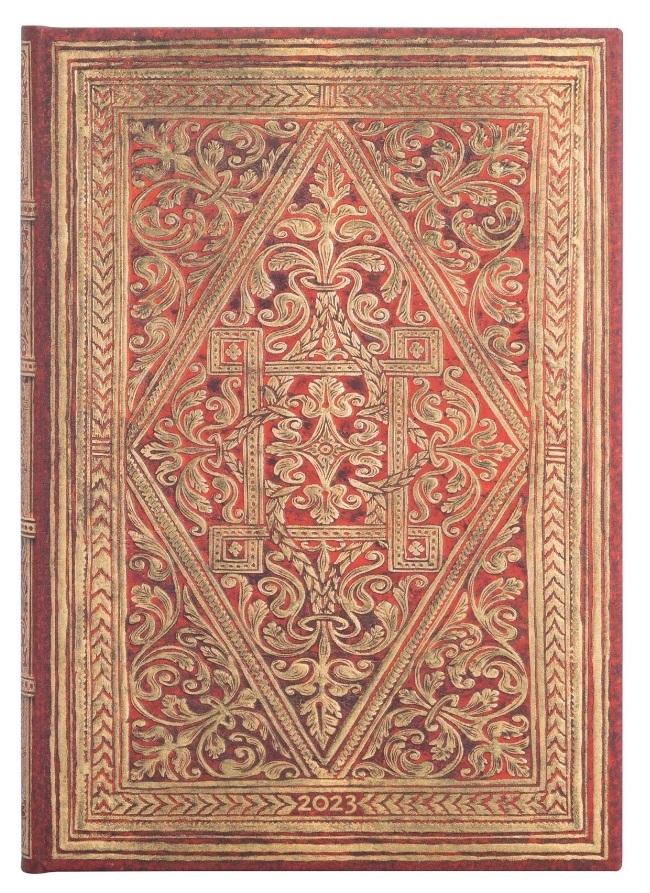 Kalendarz 2023 ekskluzywnej marki Paperblanks. Format midi typu horizontal - cały tydzień rozplanowany jest na 2 stronach. Kalendarium w języku angielskim. W środku miejsce na notatki, roczny planer, oznaczone wybrane święta międzynarodowe, mini kalendarium, międzynarodowe numery telefonów, strefy czasowe, dodatkowe informacje, mini skorowidz na adresy i telefony. Oprawa twarda. Zamkniecie na gumkę. Wymiary 130x180 mm (format midi), 160 stron. Kalendarz posiada 2 satynowe wstążki jako zakładki. Na końcu na wewnętrznej stronie okładki jest koperta na drobne notatki czy paragony. Papier ekologiczny, bezkwasowy, gramatura 100. Wzór na okładce pierwotnie wykonany był z drewna bukowego i ciemnobrązowej skóry i użyto go do oprawy Podręcznika Wieczerzy Pańskiej Jeremiaha Schweiglinuma. Został wyprodukowany w prowadzonej przez Katharine Gerlachin drukarni Berg & Neuber w Norymberdze w 1568 roku.