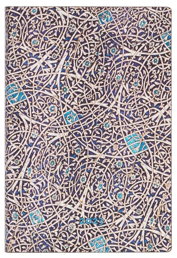 Kalendarz 2023 ekskluzywnej marki Paperblanks. Seria flexi - elastyczna oprawa i grzbiet. Format mini typu horizontal - cały tydzień rozplanowany jest na 2 stronach. Kalendarium w języku angielskim. W środku miejsce na notatki, roczny planer, oznaczone wybrane święta międzynarodowe, mini kalendarium, międzynarodowe numery telefonów, strefy czasowe, dodatkowe informacje, mini skorowidz na adresy i telefony. Wymiary 95x140 mm, 176 stron. Kalendarz posiada 2 satynowe wstążki jako zakładki. Na końcu na wewnętrznej stronie okładki jest koperta na drobne notatki czy paragony. Papier ekologiczny, bezkwasowy, gramatura 100. Czarno biały, nakrapiany turkusami wzór na okładce pochodzi z kolekcji zdjęć fotografa Gerarda Degeorge'a i najprawdopodobniej jest przykładem architektonicznej sztuki islamskiej w Grenadzie.