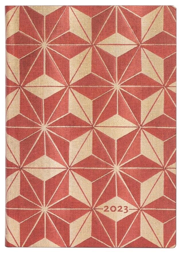 Kalendarz 2023 ekskluzywnej marki Paperblanks. Seria flexi - elastyczna oprawa i grzbiet. Format midi typu horizontal - cały tydzień rozplanowany jest na 2 stronach. Kalendarium w języku angielskim. W środku miejsce na notatki, roczny planer, oznaczone wybrane święta międzynarodowe, mini kalendarium, międzynarodowe numery telefonów, strefy czasowe, dodatkowe informacje, mini skorowidz na adresy i telefony. Wymiary 125x175 mm, 176 stron. Kalendarz posiada 2 satynowe wstążki jako zakładki. Na końcu na wewnętrznej stronie okładki jest koperta na drobne notatki czy paragony. Papier ekologiczny, bezkwasowy, gramatura 100. Okładka inspirowana wzorem kimona, który był pierwotnie drukiem w drewnie, stworzonym na początku XX wieku na potrzeby kostiumów teatralnych.