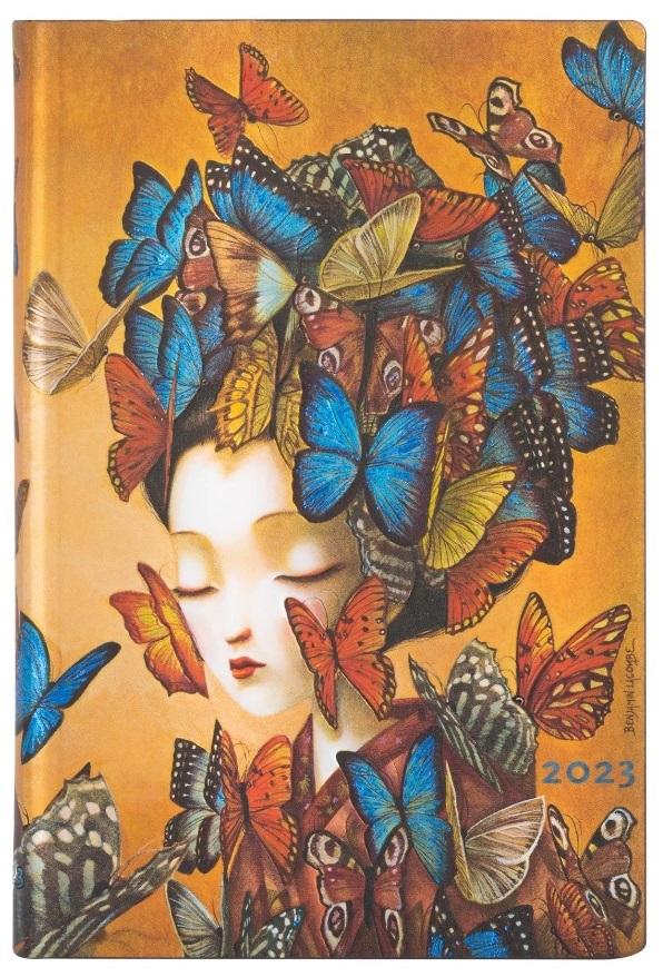 Kalendarz 2023 ekskluzywnej marki Paperblanks. Seria flexi - elastyczna oprawa i grzbiet. Format mini typu horizontal - cały tydzień rozplanowany jest na 2 stronach. Kalendarium w języku angielskim. W środku miejsce na notatki, roczny planer, oznaczone wybrane święta międzynarodowe, mini kalendarium, międzynarodowe numery telefonów, strefy czasowe, dodatkowe informacje, mini skorowidz na adresy i telefony. Wymiary 95x140 mm, 176 stron. Kalendarz posiada 2 satynowe wstążki jako zakładki. Na końcu na wewnętrznej stronie okładki jest koperta na drobne notatki czy paragony. Papier ekologiczny, bezkwasowy, gramatura 100. Okładka inspirowana twórczością pisarza i ilustratora Benjamina Lacombe, w tym przypadku jest to ilustracja z oprawy jego książki Madame Butterfly.