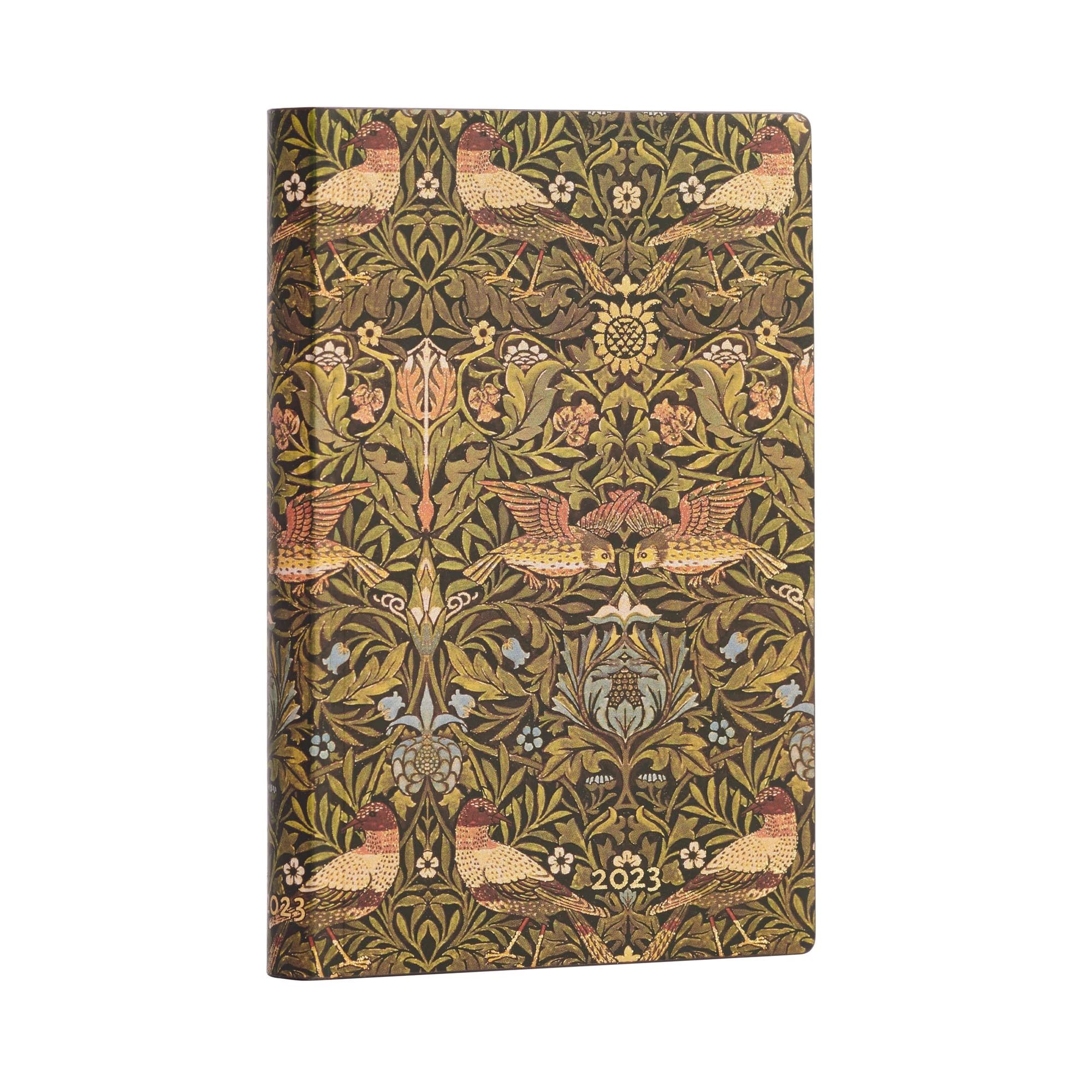 Kalendarz 2023 ekskluzywnej marki Paperblanks. Seria flexi - elastyczna oprawa i grzbiet. Format mini typu horizontal - cały tydzień rozplanowany jest na 2 stronach. Kalendarium w języku angielskim. W środku miejsce na notatki, roczny planer, oznaczone wybrane święta międzynarodowe, mini kalendarium, międzynarodowe numery telefonów, strefy czasowe, dodatkowe informacje, mini skorowidz na adresy i telefony. Wymiary 95x140 mm, 176 stron. Kalendarz posiada 2 satynowe wstążki jako zakładki. Na końcu na wewnętrznej stronie okładki jest koperta na drobne notatki czy paragony. Papier ekologiczny, bezkwasowy, gramatura 100. Wzór na okładce został stworzony w 1878 roku przez Williama Morrisa (1834-1896) - jednego z najbardziej znanych artystów sztuki dekoracyjnej.