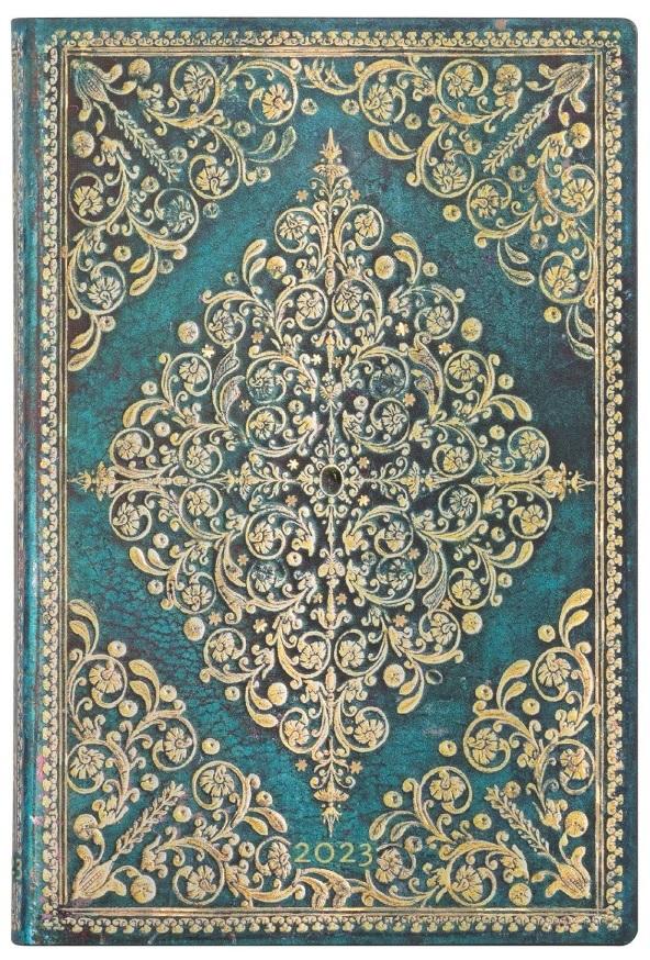 Kalendarz 2023 ekskluzywnej marki Paperblanks. Seria flexi - elastyczna oprawa i grzbiet. Format mini typu horizontal - cały tydzień rozplanowany jest na 2 stronach. Kalendarium w języku angielskim. W środku miejsce na notatki, roczny planer, oznaczone wybrane święta międzynarodowe, mini kalendarium, międzynarodowe numery telefonów, strefy czasowe, dodatkowe informacje, mini skorowidz na adresy i telefony. Wymiary 95x140 mm, 176 stron. Kalendarz posiada 2 satynowe wstążki jako zakładki. Na końcu na wewnętrznej stronie okładki jest koperta na drobne notatki czy paragony. Papier ekologiczny, bezkwasowy, gramatura 100. Kwiatowy wzór na okładce z motywem rozety inspirowany jest włoską oprawą książki z 1620 roku.