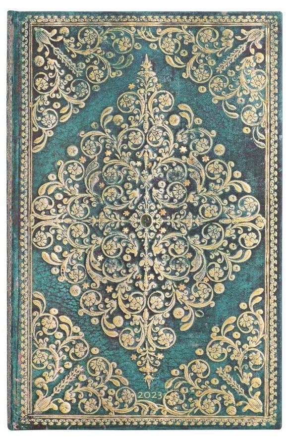 Kalendarz 2023 ekskluzywnej marki Paperblanks. Format maxi typu horizontal - cały tydzień rozplanowany jest na 2 stronach. Kalendarium w języku angielskim. W środku miejsce na notatki, roczny planer, oznaczone wybrane święta międzynarodowe, mini kalendarium, międzynarodowe numery telefonów, strefy czasowe, dodatkowe informacje, mini skorowidz na adresy i telefony. Oprawa twarda. Zamkniecie na gumkę. Wymiary 135x210 mm, 160 stron. Kalendarz posiada 2 satynowe wstążki jako zakładki. Na końcu na wewnętrznej stronie okładki jest koperta na drobne notatki czy paragony. Papier ekologiczny, bezkwasowy, gramatura 100. Kwiatowy wzór na okładce z motywem rozety inspirowany jest włoską oprawą książki z 1620 roku.