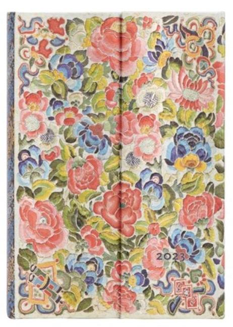 Kalendarz 2023 ekskluzywnej marki Paperblanks. Każdy dzień rozplanowany jest na osobnej stronie (włącznie z sobota i niedzielą). Kalendarium w języku angielskim. W środku miejsce na notatki, roczny planer, oznaczone wybrane święta międzynarodowe, mini kalendarium, międzynarodowe numery telefonów, strefy czasowe, dodatkowe informacje, mini skorowidz na adresy i telefony. Oprawa twarda. Zamkniecie na magnes. Wymiary 95x140 mm (format mini), 416 stron. Kalendarz posiada 2 satynowe wstążki jako zakładki. Na końcu na wewnętrznej stronie okładki jest koperta na drobne notatki czy paragony. Papier ekologiczny, bezkwasowy, gramatura 80. Wzór na okładce jest reprodukcją pięknie haftowanej chińskiej spódnicy operowej z czasów panowania dynastii Qing (1644-1911).