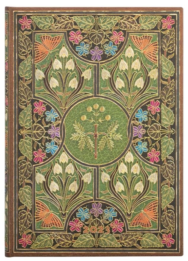 Kalendarz 2023 ekskluzywnej marki Paperblanks. Format midi typu horizontal - cały tydzień rozplanowany jest na 2 stronach. Kalendarium w języku angielskim. W środku miejsce na notatki, roczny planer, oznaczone wybrane święta międzynarodowe, mini kalendarium, międzynarodowe numery telefonów, strefy czasowe, dodatkowe informacje, mini skorowidz na adresy i telefony. Oprawa twarda. Zamkniecie na gumkę. Wymiary 130x180 mm (format midi), 160 stron. Kalendarz posiada 2 satynowe wstążki jako zakładki. Na końcu na wewnętrznej stronie okładki jest koperta na drobne notatki czy paragony. Papier ekologiczny, bezkwasowy, gramatura 100. Całość zdobi piękna okładka z motywami roślinnymi, która jest reprodukcją oprawy dzieł angielskiego poety i dramaturga Percy Bysshea Shelleya.