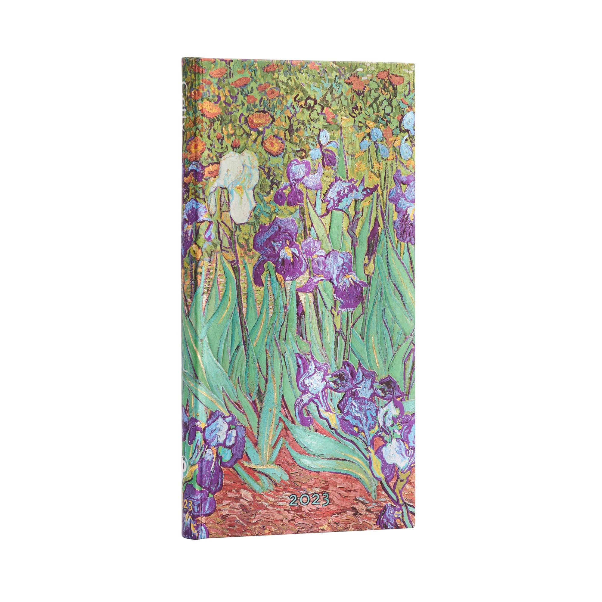 Kalendarz 2023 ekskluzywnej marki Paperblanks. Format slim typu horizontal - cały tydzień rozplanowany jest na 2 stronach. Kalendarium w języku angielskim. W środku miejsce na notatki, roczny planer, oznaczone wybrane święta międzynarodowe, mini kalendarium, międzynarodowe numery telefonów, strefy czasowe, dodatkowe informacje, mini skorowidz na adresy i telefony. Oprawa twarda. Zamkniecie na gumkę. Wymiary 95x180 mm, 160 stron. Kalendarz posiada 2 satynowe wstążki jako zakładki. Na końcu na wewnętrznej stronie okładki jest koperta na drobne notatki czy paragony. Papier ekologiczny, bezkwasowy, gramatura 100. Okładka inspirowana obrazem Irysy Vincenta van Gogha.