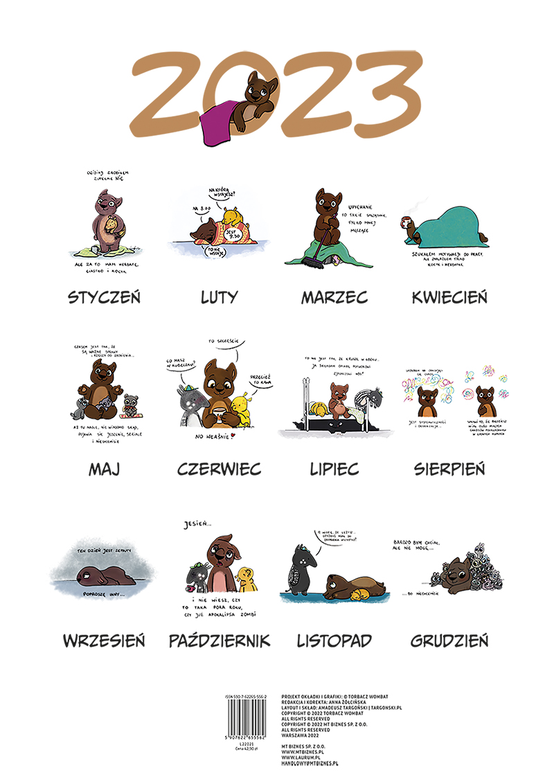 Czym nas zaskoczy 2023 rok? Może czymś miłym, a może po prostu w końcu będzie normalnym, spokojnym rokiem? Nic nie mówię, tak tylko sugeruję. Chyba jednak najlepiej nie spodziewać się niczego i być przyjemnie zaskoczonym niż dramatycznie się rozczarować. Jedyne, czego możemy być pewni, to tego, że ciastki i kocyk są niezmiennie dobre na poprawę humoru w każdych warunkach. I oczywiście Wombat. Mały, uroczy, grubodupki leniuszek, który z chęcią udowodni, że kalendarz trzeba traktować jak zbiór dni, w którym można coś zaplanować, ale wcale nie trzeba. O tym, że jak czegoś nie można, ale bardzo się chce, to można, wiedzą wszyscy, ale wciąż za mało osób wie, że jak się bardzo, bardzo czegoś nie chce, to wcale nie trzeba! I właśnie te i inne zasady leniwego życia znajdziecie w tym kalendarzu. Będzie oczywiście dużo Torbacza Wombata z jego głupiutkimi mądrościami, ciastkami, kocykiem i uroczymi przyjaciółmi – Pancernikiem (to ta żółta świnka), Chłopcem Tapirem (to ten w czapce) i bucowatym żółwiem (to ten w skorupie).