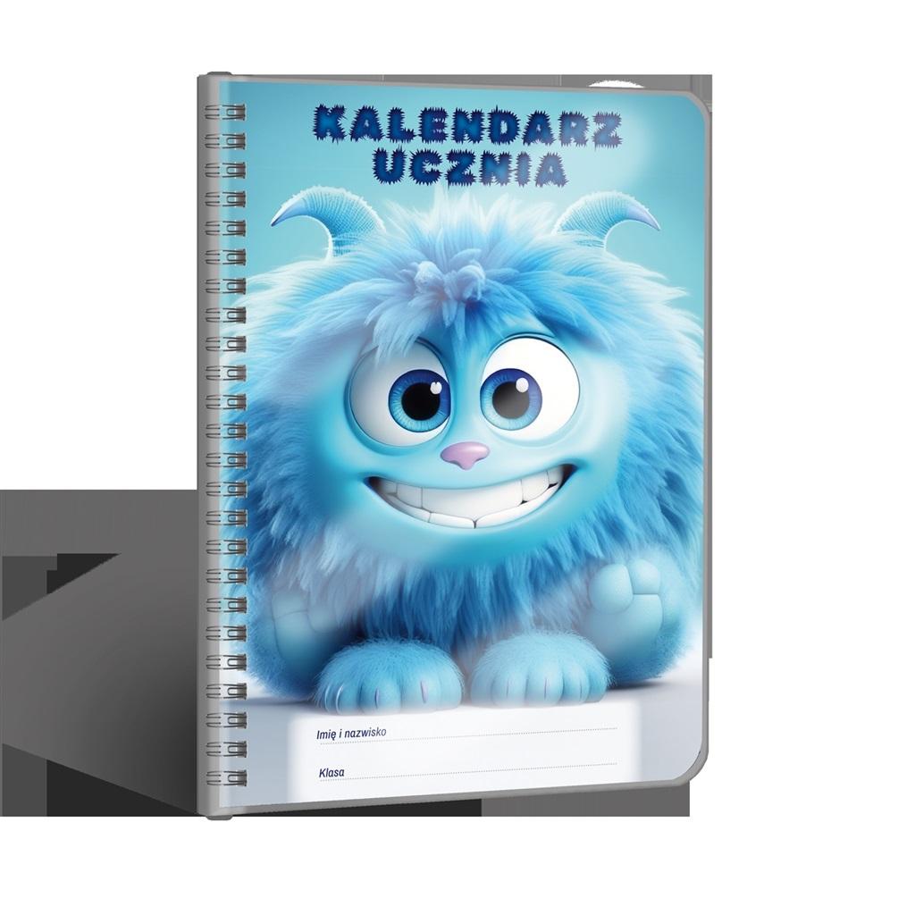 "Format A5;120 str. Miękka oprawa,łączony na spirali po długim boku, zadruk full kolor, kalendarium od września 2023 do sierpnia 2024, rozkład kalendarium tygodniowy, tabele ocen, szkolne tabele miar, itp."