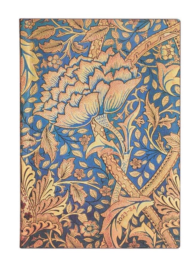 Kalendarz 18-miesięczny (lipiec 2023-grudzień 2024) ekskluzywnej marki Paperblanks. Format Midi typu Horizontal - cały tydzień rozplanowany na 2 stronach. Elastyczna oprawa i grzbiet. Kalendarium w języku angielskim. W środku miejsce na notatki, roczny planer, oznaczone wybrane święta międzynarodowe, mini kalendarium, międzynarodowe numery telefonów, strefy czasowe, dodatkowe informacje, mini skorowidz na adresy i telefony. Kalendarz posiada 2 satynowe wstążki jako zakładki. Na końcu na wewnętrznej stronie okładki jest koperta na drobne notatki czy paragony. Papier ekologiczny, bezkwasowy, gramatura 80. Wymiary 125 x 175 mm, 224 strony. Wzór na okładce inspirowany jest szkicem wykonanym przez Williama Morrisa (1834-1896) - jednego z najbardziej znanych artystów sztuki dekoracyjnej.
