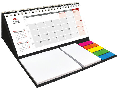 Wygodny kalendarz stojący na biurko z przejrzystym kalendarium w układzie miesięcznym z poręcznymi karteczkami samoprzylepnymi do notowania. Przydatny zwłaszcza w biurze. W kalendarzu zaznaczono święta. Kalendarium spiralowane.